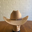 Sombrero de gamuza estilo patrón en tono arena claro, con un acabado suave y natural. Su cinta trenzada en cuero con detalle metálico central resalta la fineza del diseño. Su color neutro lo convierte en una opción perfecta para un look elegante y campestre a la vez.